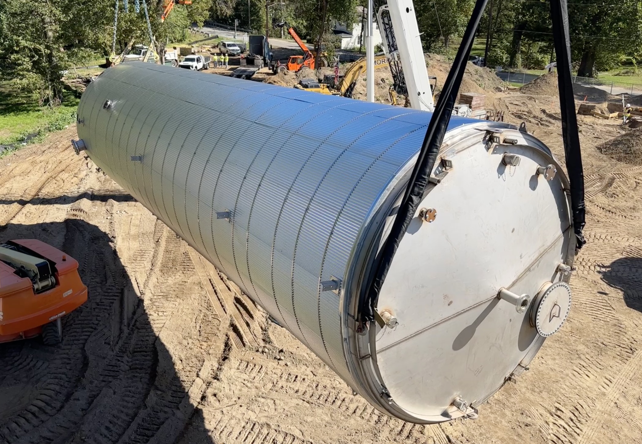 To reduce the carbon intensity of its process, DDB will use anaerobic digestion to produce biogas to power its distillation system. Waste from the distillation process along with MMPA’s process wastewater will be fed into four 30,000 gallon digesters made by EMG International. EMG digesters are compact since they processes wastewater at a higher rate than a traditional system, making them ideal for Constantine’s small footprint. When operational, the digesters will cut organic loading by 10X and make enough biogas to run distillation. The digesters were manufactured by EMG in Philadelphia and shipped to Constantine by truck.